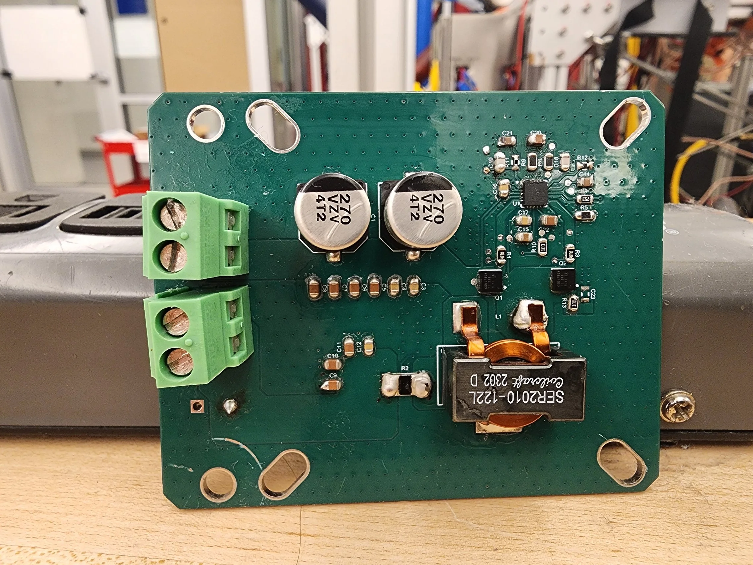 This boost converter module allows for efficient and compact conversion of standard 12V nominal battery voltages to a steady 24V for high power loads. This module will fly on a liquid-bipropellant rocket to supply the necessary power to the valves of the fluid system, and serve as a valuable learning experience in power electronics.